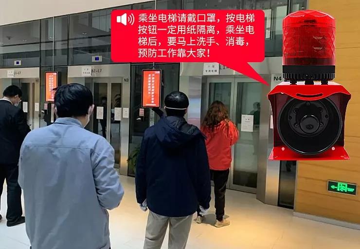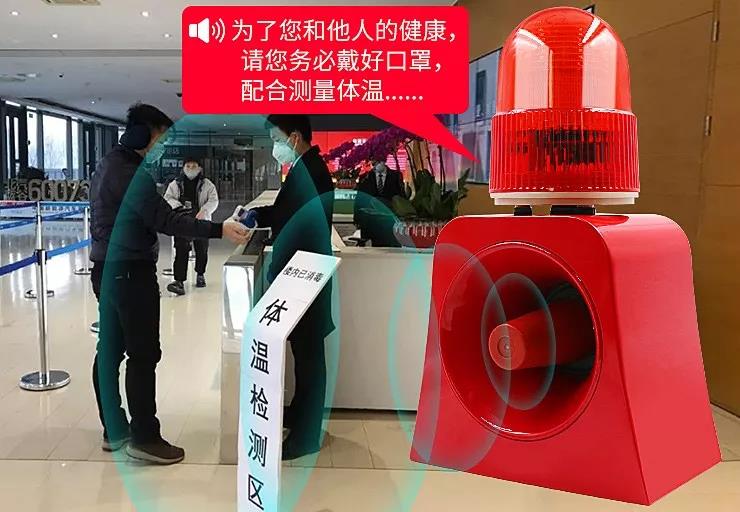 聲光報警器語音定制內容示例:請入廠員工有序排隊測量體溫、消毒、戴口罩,登記合格方能進入。