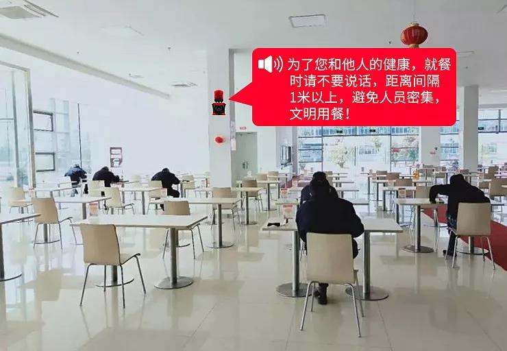 聲光報警器語音定制內容示例:為了您和他人的健康,就餐時請不要說話,距離間隔1米以上,避免人員密集,文明用餐!